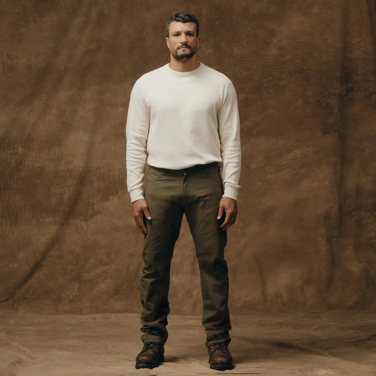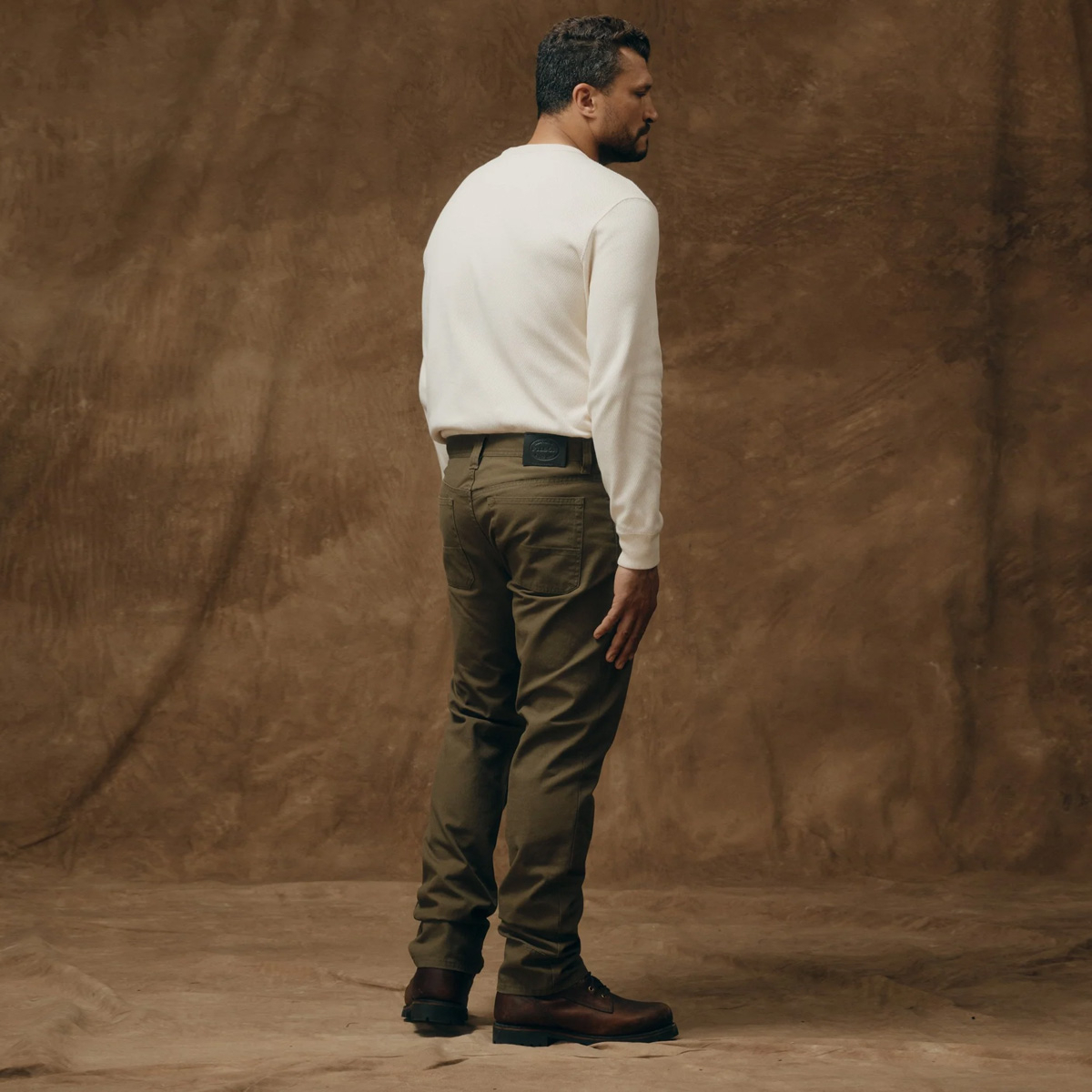 De Filson Dry Tin Cloth 5-Pocket Pants Marsh Olive combineert de vertrouwde pasvorm van je favoriete jeans met de onovertroffen robuustheid van Filson’s kenmerkende Tin Cloth. Gemaakt van de ongewaxte versie van Filson's iconische canvas—al tientallen jaren vertrouwd om bestand te zijn tegen struikgewas, slijtage en zwaar gebruik—biedt deze broek uitzonderlijke duurzaamheid in een lichter gewicht dan de meeste denim broeken.