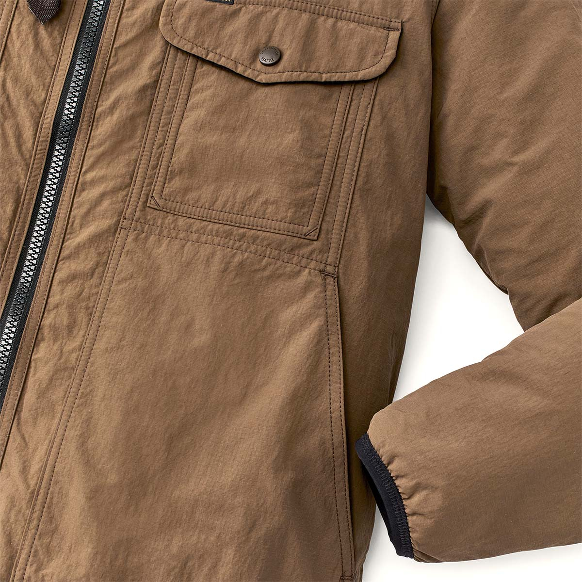 De omgekeerde zijde bestaat uit 4-oz. ripstop nylon met een kruispatroonweefsel dat uitzonderlijke scheurweerstand biedt. Deze stof blokkeert wind en weerstaat slijtage, waardoor het de perfecte buitenlaag is voor onvoorspelbare weersomstandigheden.