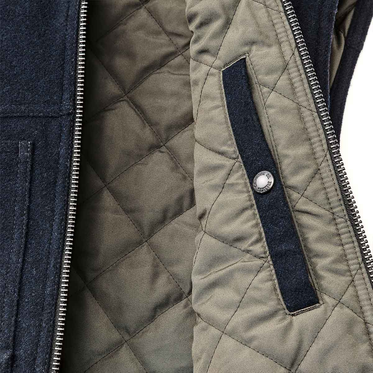 De buitenlaag van wolmix, versterkt met nylon, is slijtvast en blijft isoleren, zelfs wanneer hij nat is. De binnenvoering van licht, sneldrogend polyester houdt warmte vast zonder extra volume toe te voegen. De geribde kraag van wol, nylon en elastaan biedt extra warmte en flexibiliteit, terwijl de voering van Filsons Cover Cloth-katoen langdurig comfort en stevigheid garandeert.