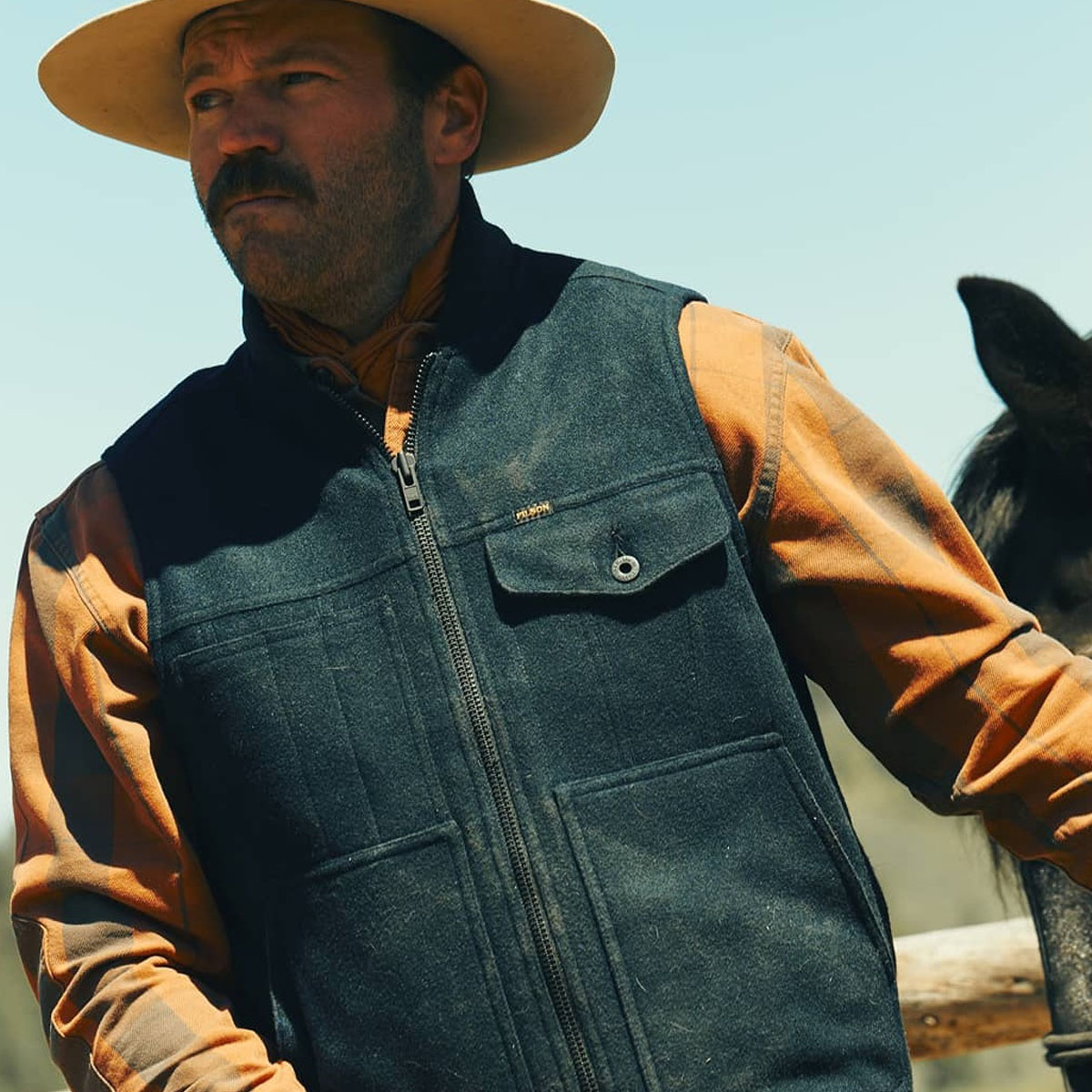 Het ontwerp is geïnspireerd op Filsons klassieke werkjassen en heeft functionele borstzakken, handwarmerzakken en een verlengde achterkant voor extra bescherming bij bukken of zwaar werk. Een vest dat blijft presteren wanneer de temperatuur daalt.